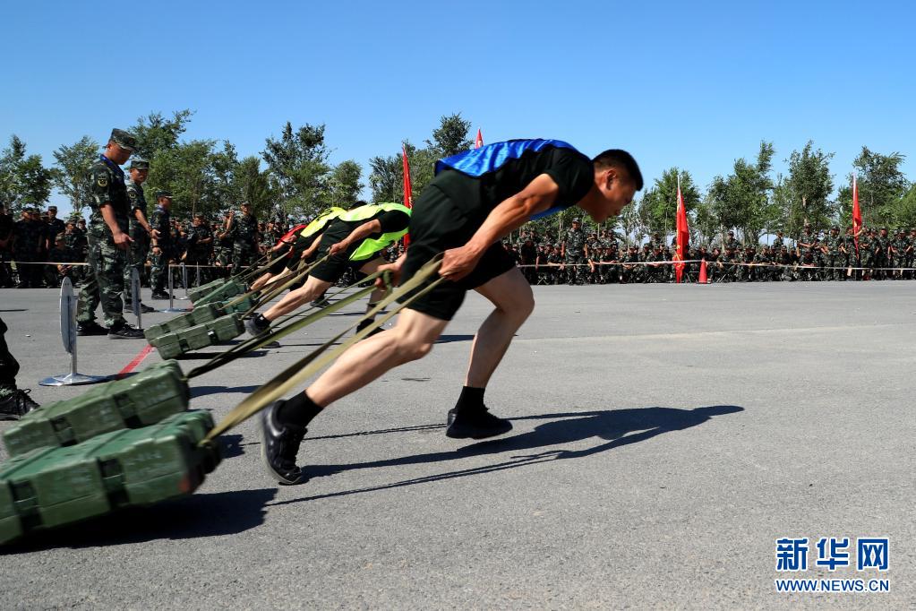 武警新疆总队某支队特战一中队官兵进行负重组合课目训练(2019年7月11日摄)。新华社发(彭安田 摄)