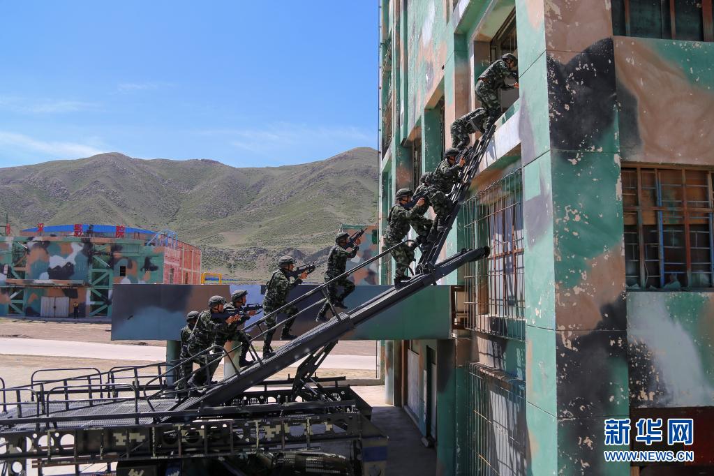 武警新疆总队某支队特战一中队官兵组织高层楼房反劫持突入训练(2018年6月6日摄)。新华社发(彭安田 摄)