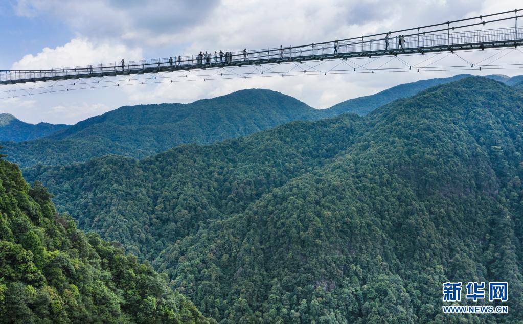 5月14日,游客在三百山景区玻璃天桥漫步(无人机照片)。