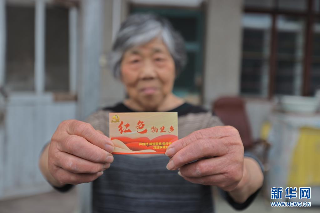5月14日,芦胜村村民黄培红展示党建联建服务卡片。