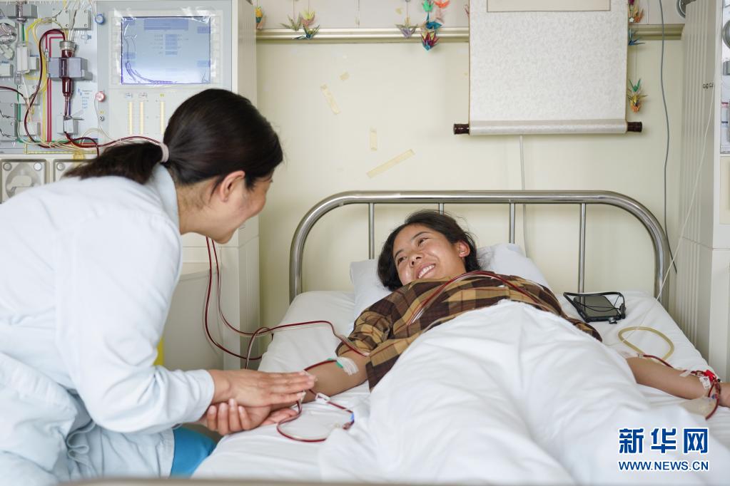 医生摸着拉增的手和她聊天,造血干细胞整个采集时间需要近4个小时(资料图片)。