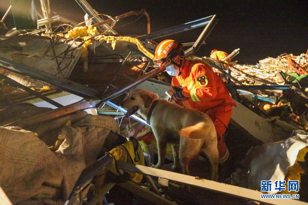 5月15日,武汉消防救援支队的队员在武汉市蔡甸区一处被龙卷风刮倒的厂房内搜救。