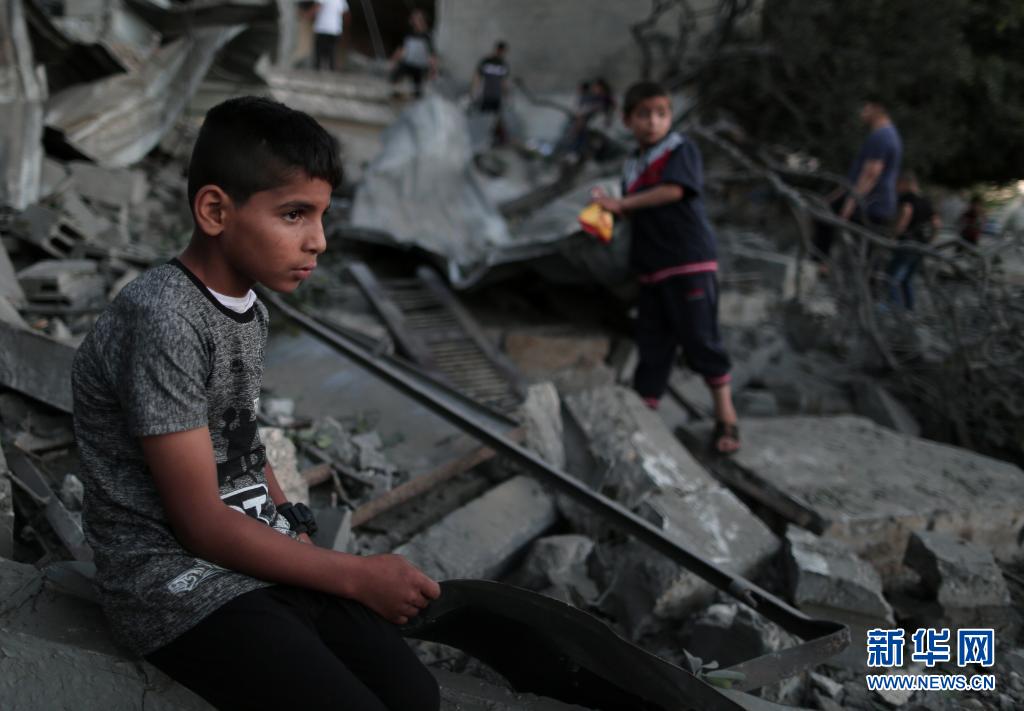 5月14日,在加沙地带城市汗尤尼斯,巴勒斯坦儿童坐在被以军空袭摧毁的一处房屋废墟上。