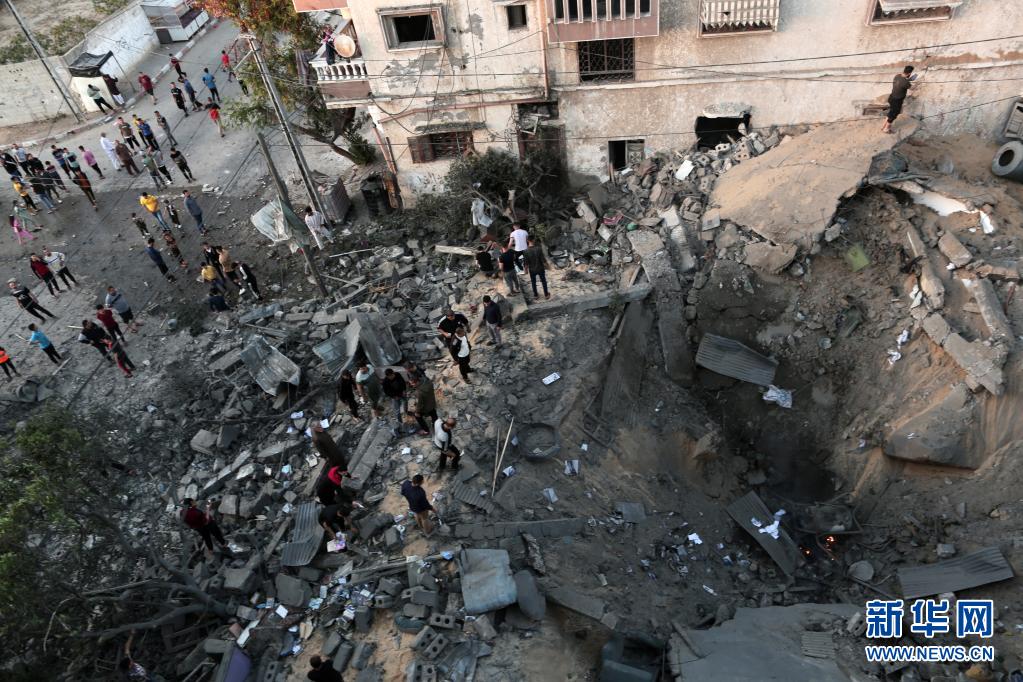 5月14日,巴勒斯坦人在加沙地带城市汗尤尼斯查看被以军空袭摧毁的一处房屋。