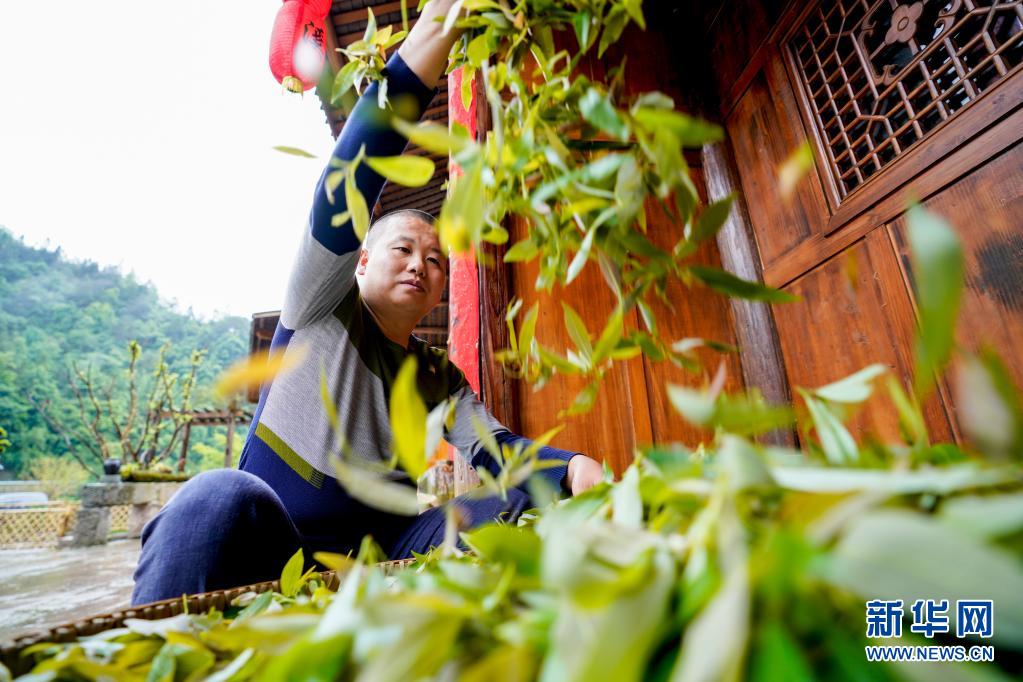 5月13日,刘晓兵在对新摘的老鹰茶树嫩叶进行摊晒和选叶。