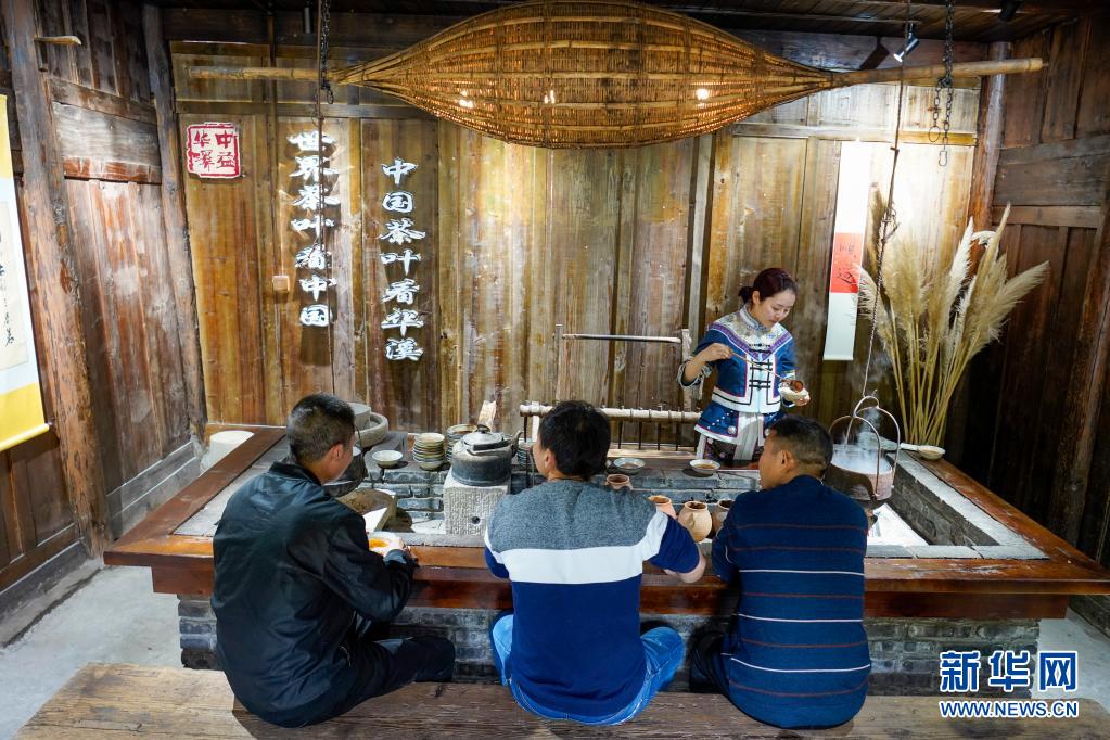 5月13日,在石柱县中益乡刘晓兵的老鹰茶工作室内,茶艺师在为前来选购茶叶的游客烹煮老鹰茶。