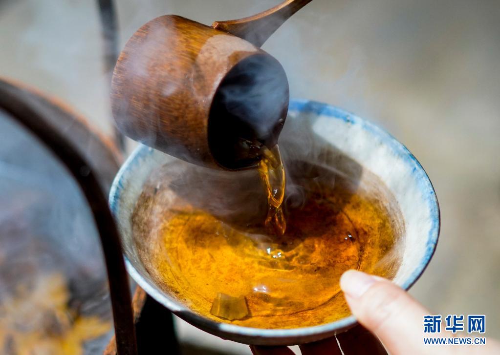 5月13日,茶艺师在将煮好的老鹰茶舀入土碗中。
