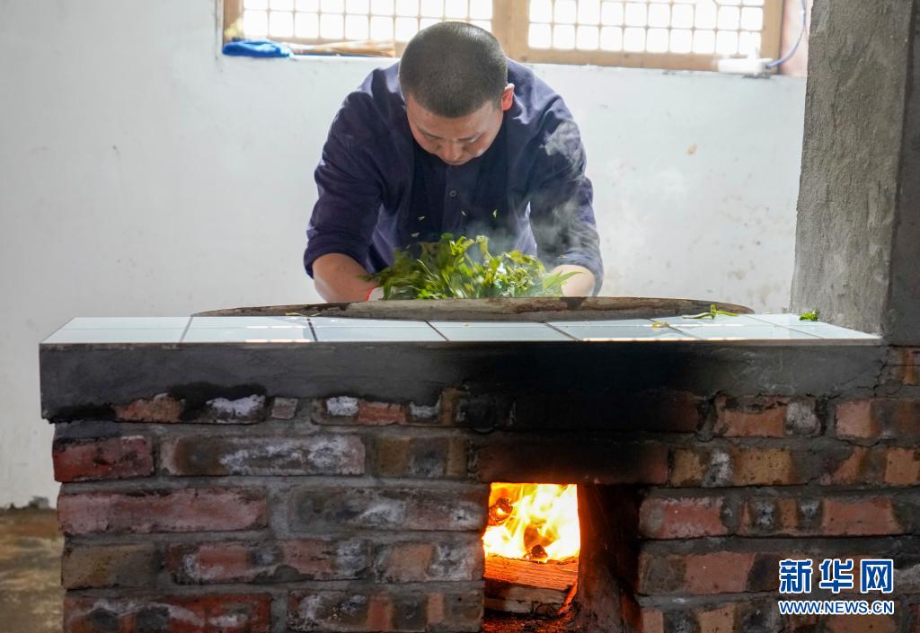 5月13日,刘晓兵在手工炒制老鹰茶嫩叶。