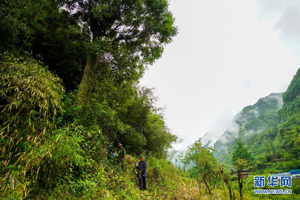 5月13日,在采摘百年野生老鹰茶树结束后,刘晓兵(右一)带着村民开始进行转运。