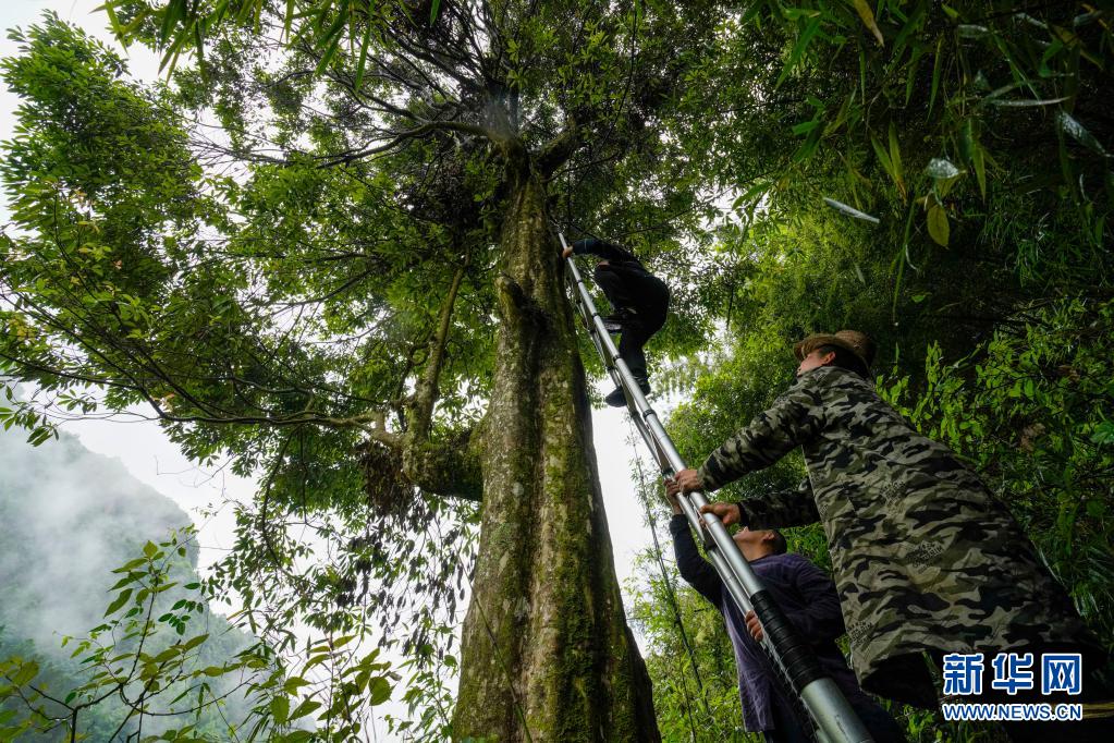 5月13日,在石柱县中益乡,村民上树准备采摘百年老鹰茶树上的嫩叶。