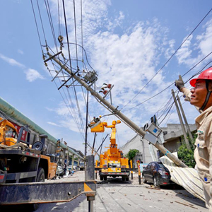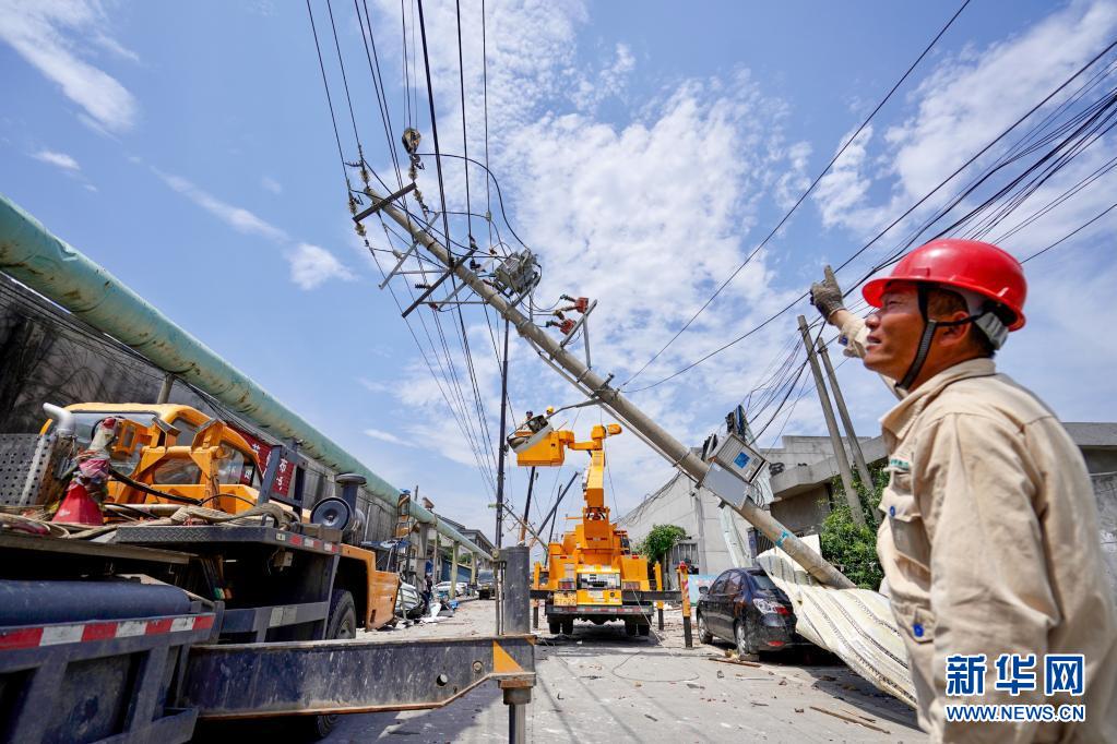 5月15日,国网苏州供电公司的工作人员在苏州市吴江区盛泽镇电力设施受损处进行抢修。