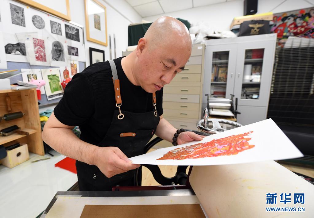 在北京市健翔学校,王昆在检查制作完成的版画(5月12日摄)。