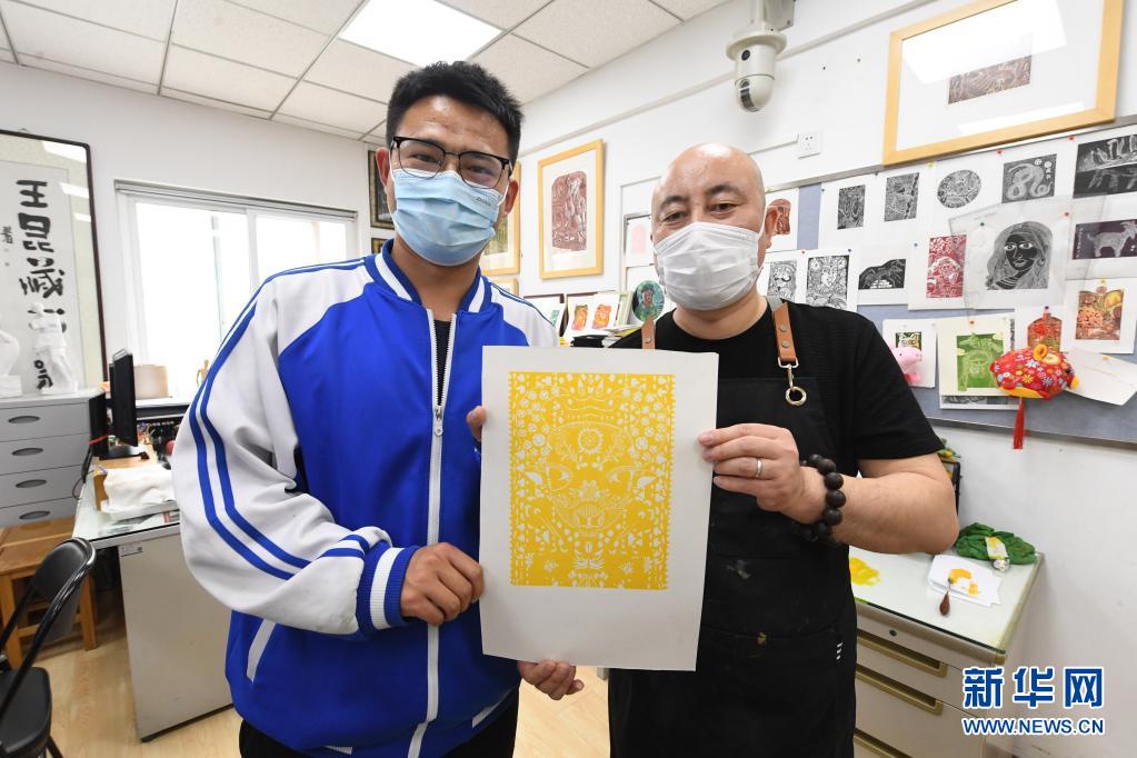 在北京市健翔学校,王昆(右)与学生一起展示学生制作的版画(5月13日摄)。