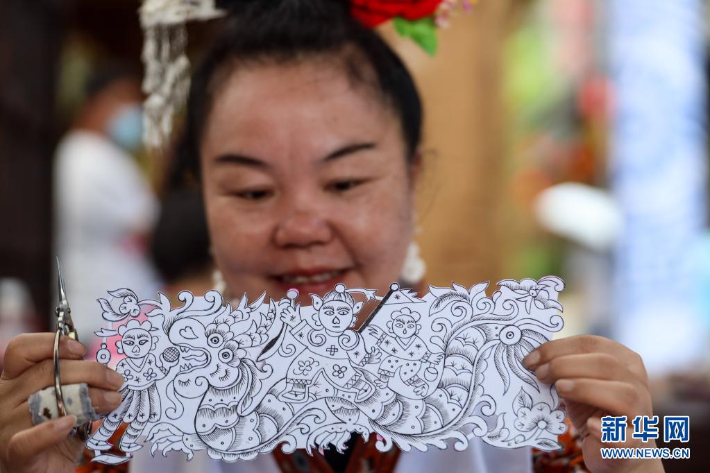 5月15日,非遗传承人姜文英在丹寨万达小镇内展示自己设计的苗族剪纸。
