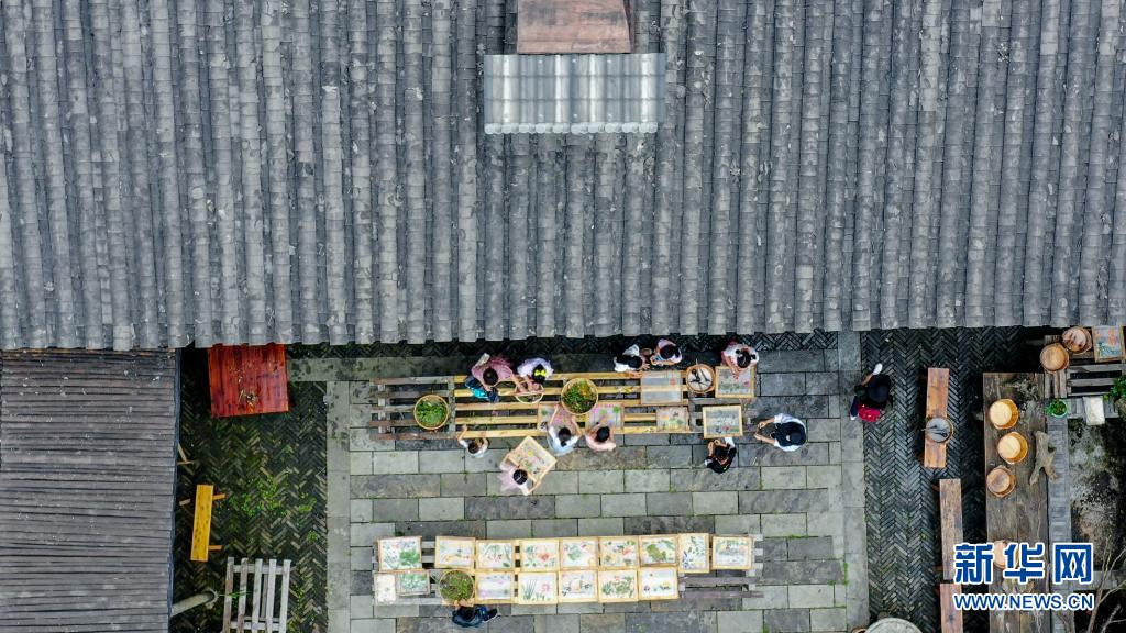 5月15日,游客在丹寨万达小镇内体验使用古法造纸技艺制作花草纸(无人机照片)。