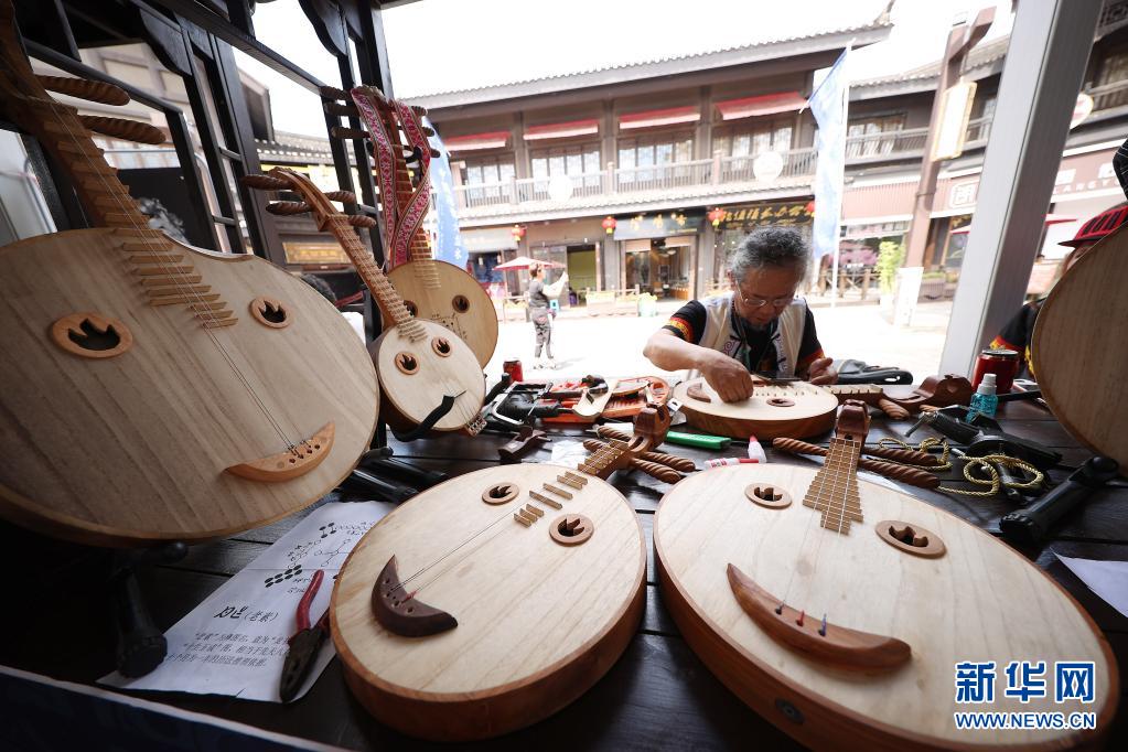 5月15日,在丹寨万达小镇非遗展示区,彝族月琴制作传承人在现场制作月琴。