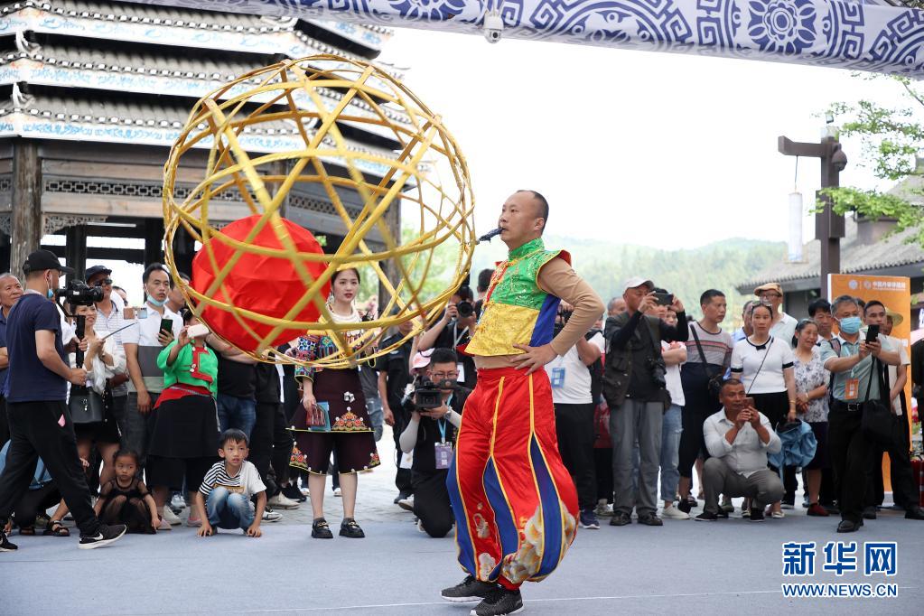 5月15日,非遗传承人在丹寨万达小镇非遗展示区表演非遗绝技“奉贤滚灯”。