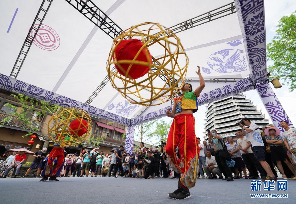 5月15日,非遗传承人在丹寨万达小镇非遗展示区表演非遗绝技“奉贤滚灯”。
