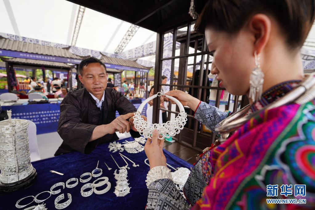 5月15日,非遗传承人吴水根在丹寨万达小镇向苗族群众介绍苗族银饰。