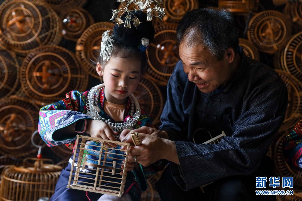 5月15日,非遗传承人杨雪亮(右)在指导一名苗族女孩制作鸟笼。
