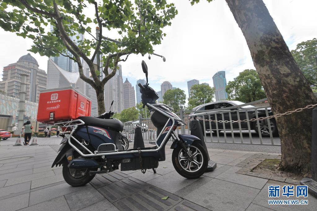 5月15日,在上海市浦东新区银城中路,一辆电动车停靠在盲道上。