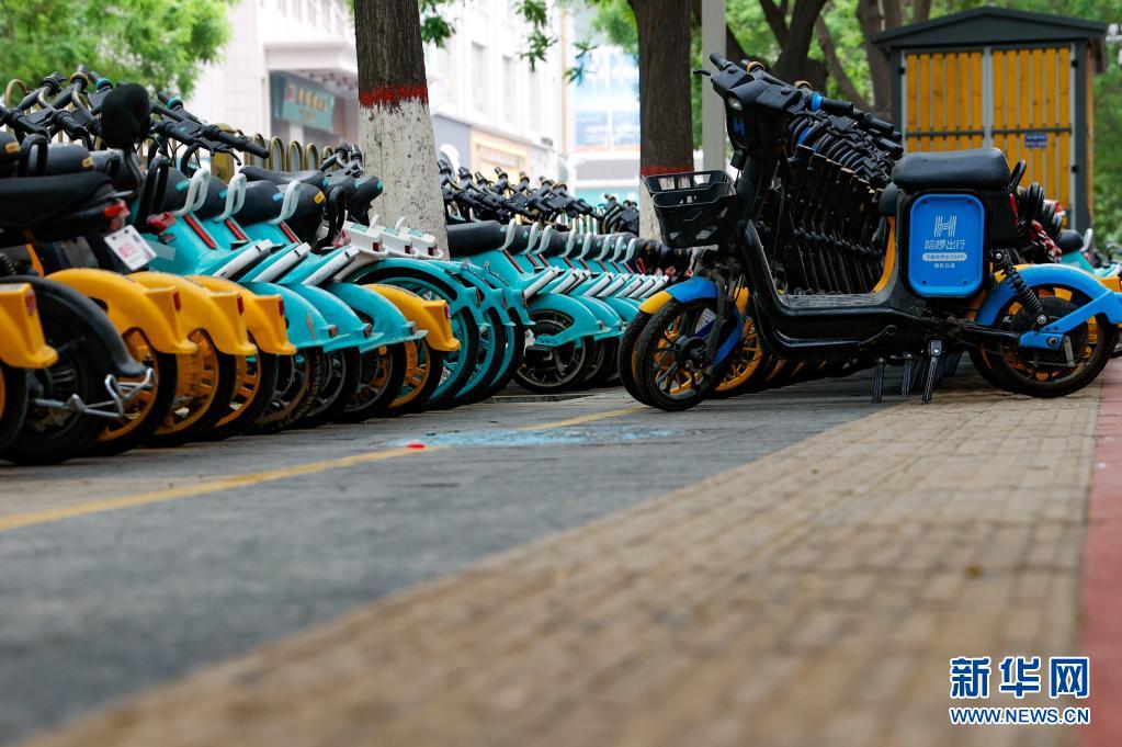 在宁夏银川市凤凰商业广场附近,一段盲道上停放着一排共享电动车(5月14日摄)。