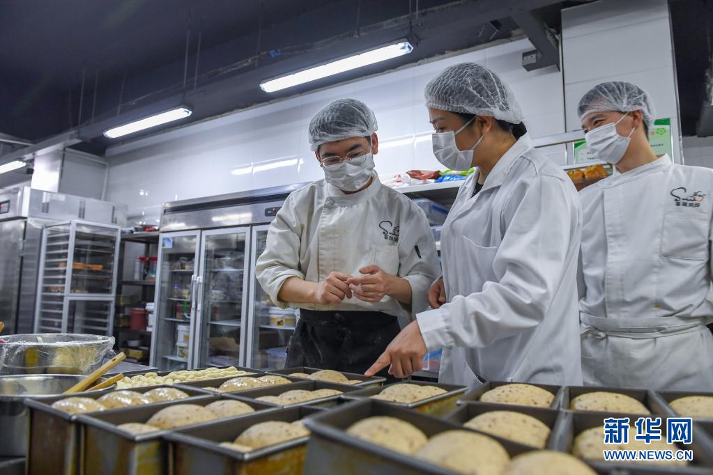 5月14日,在“善满烘焙”就业实训基地,胡艳萍(中)询问残障员工的工作情况。