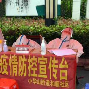 5月15日,在安徽省六安市裕安区一小区门口,陈文芳(右)和韦玥在疫情防控宣传台前累得睡着。