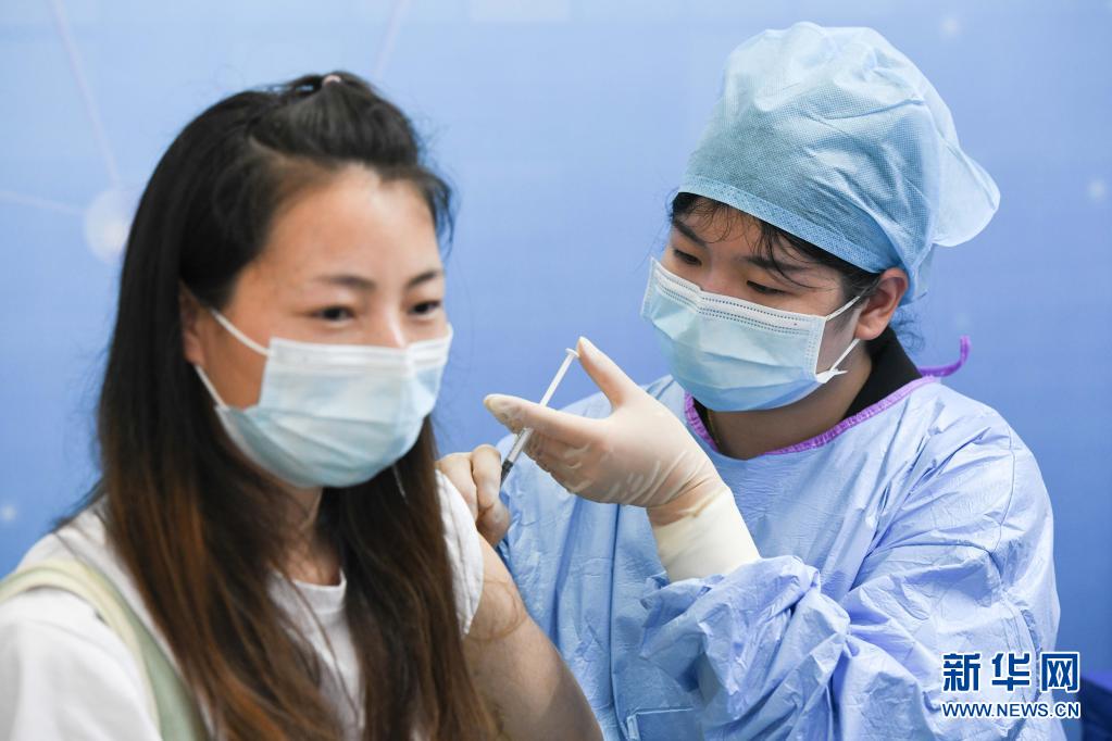 5月15日,在合肥市蜀山区奥体中心方舱接种点,市民(左)在接种新冠疫苗。