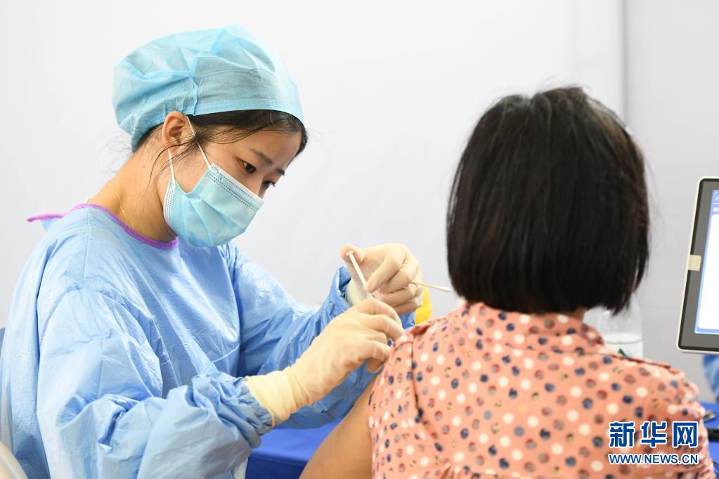 5月15日,在合肥市蜀山区奥体中心方舱接种点,市民(右)在接种新冠疫苗。