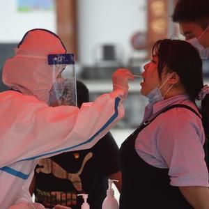5月15日,在六安市裕安区和顺社区,医护人员为居民做核酸检测。