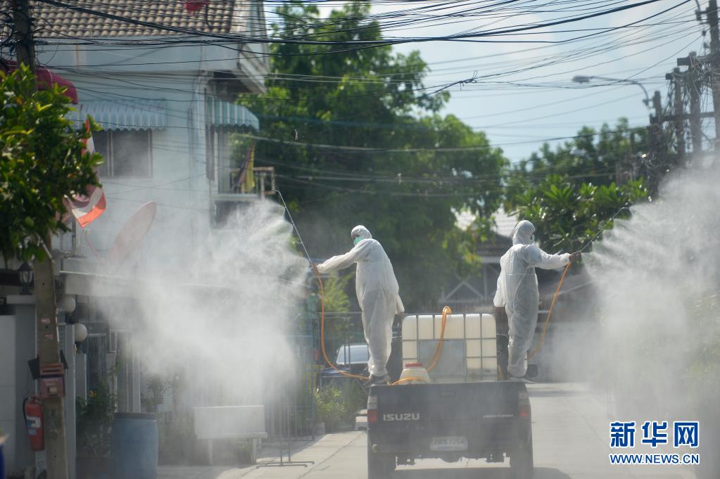 5月15日,防疫人员在泰国曼谷一处社区内喷洒消毒剂。