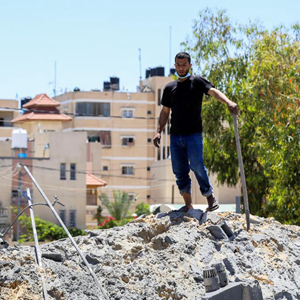 5月15日,一名巴勒斯坦人在加沙地带城市汗尤尼斯查看被以军空袭摧毁的一处房屋。