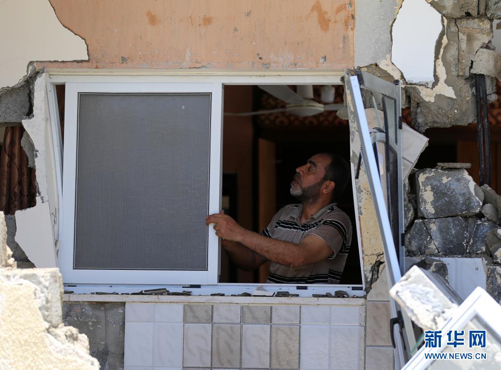 5月15日,一名巴勒斯坦人在加沙地带城市汗尤尼斯查看被以军空袭摧毁的一处房屋。
