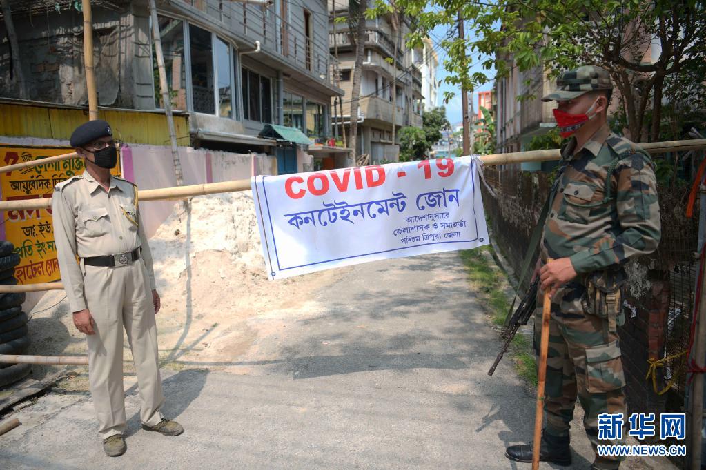 5月15日,安保人员在印度阿加尔塔拉一处隔离区外执勤。