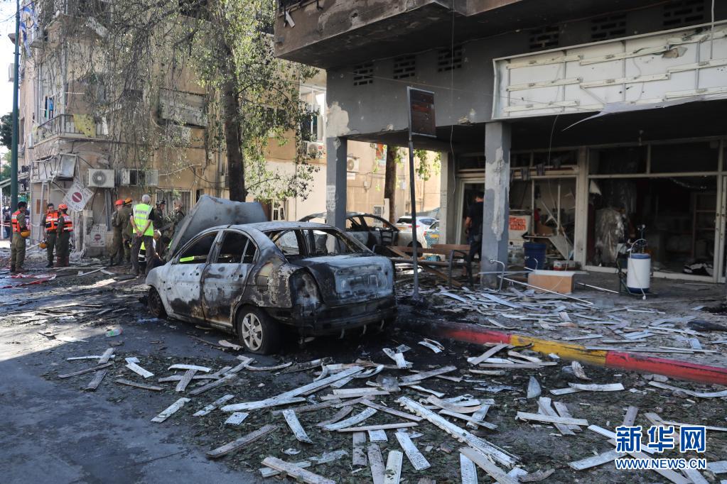 5月15日,以色列中部城市拉马特甘街头一辆汽车被巴勒斯坦发射的火箭弹损毁。