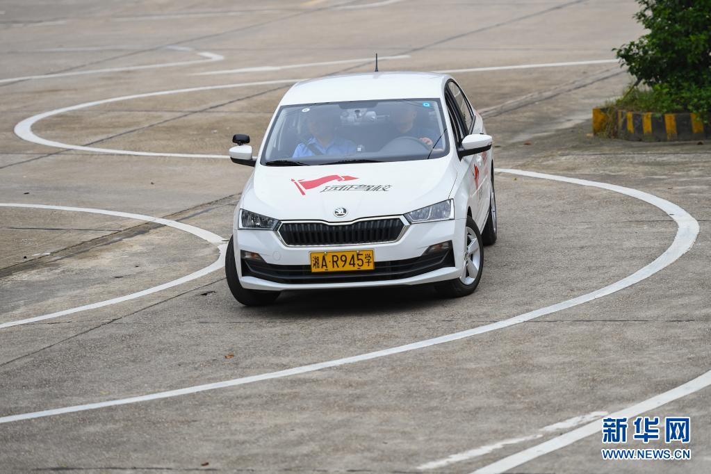 在湖南省长沙市天心区一所驾校,田方金(右)在曲线行驶(5月12日摄)。