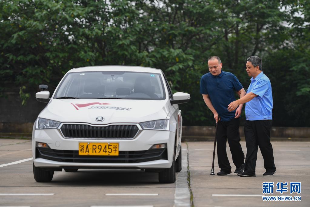 在湖南省长沙市天心区一所驾校,田方金(左)在驾校教练周启华的搀扶下准备进入车内练车(5月12日摄)。