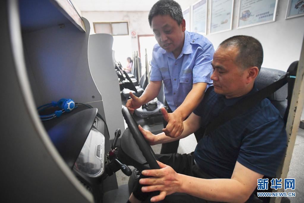 在湖南省长沙市天心区一所驾校,田方金(右)在模拟驾驶室听教练周启华讲解如何使用方向盘(5月12日摄)。