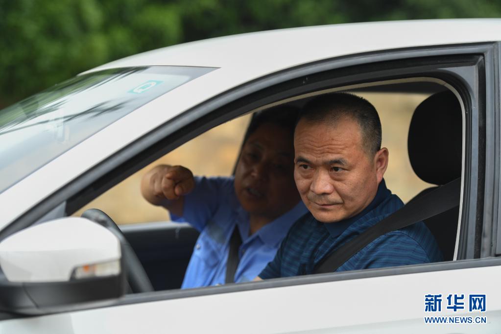 在湖南省长沙市天心区一所驾校,田方金(右)在练习倒车入库(5月12日摄)。