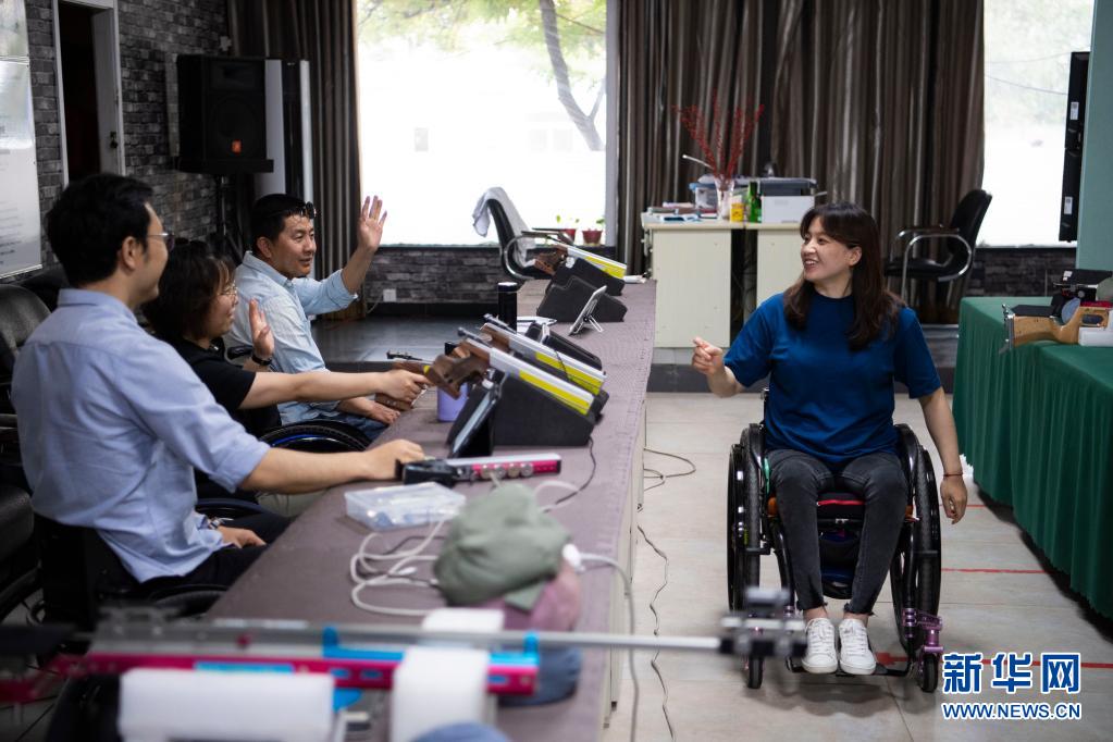 在位于太原的山西省残疾人射击射箭训练基地内,王筱莉(右一)训练结束后向队友道别(5月12日摄)。