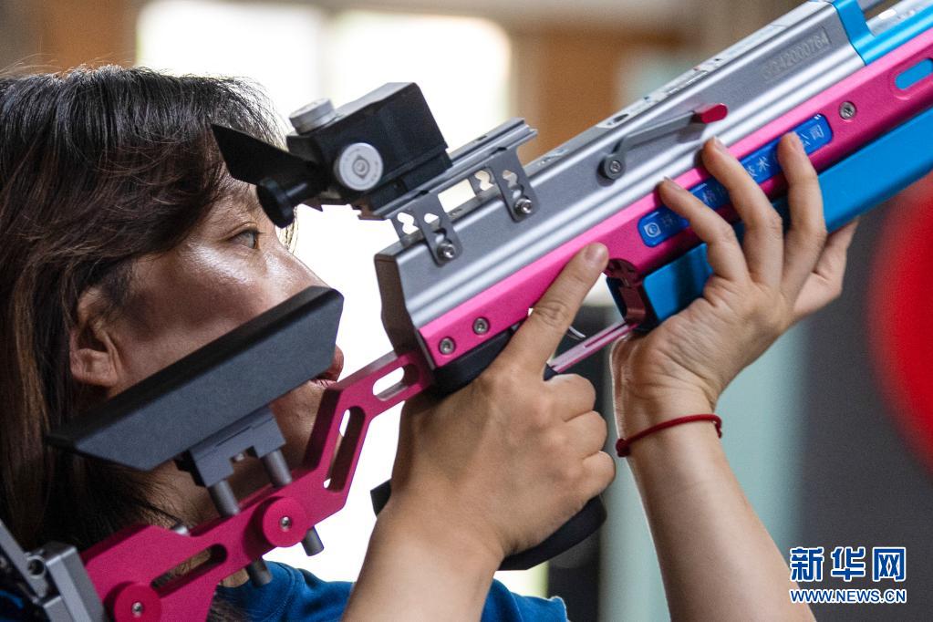 在位于太原的山西省残疾人射击射箭训练基地内,王筱莉练习气步枪射击(5月12日摄)。