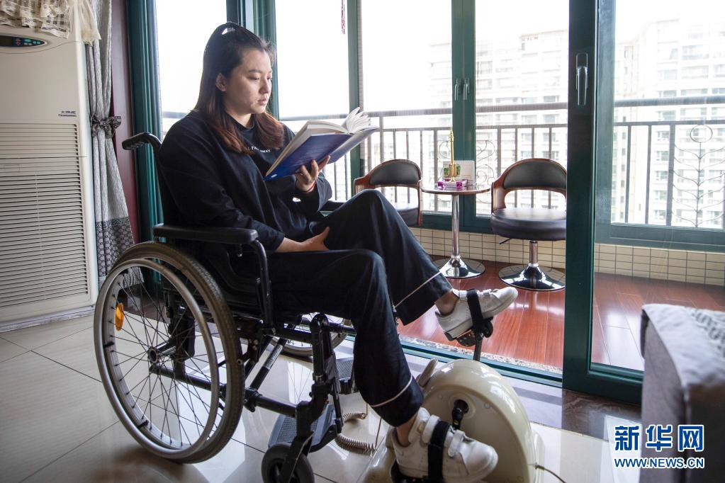 王筱莉在太原家中一边进行康复训练一边看书(5月11日摄)。