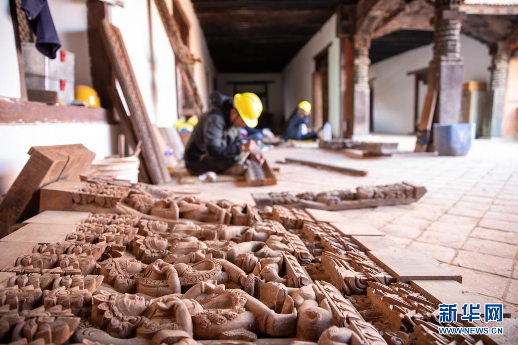 2019年10月10日,在尼泊尔加德满都杜巴广场,尼泊尔工人们在九层神庙修复现场工作。