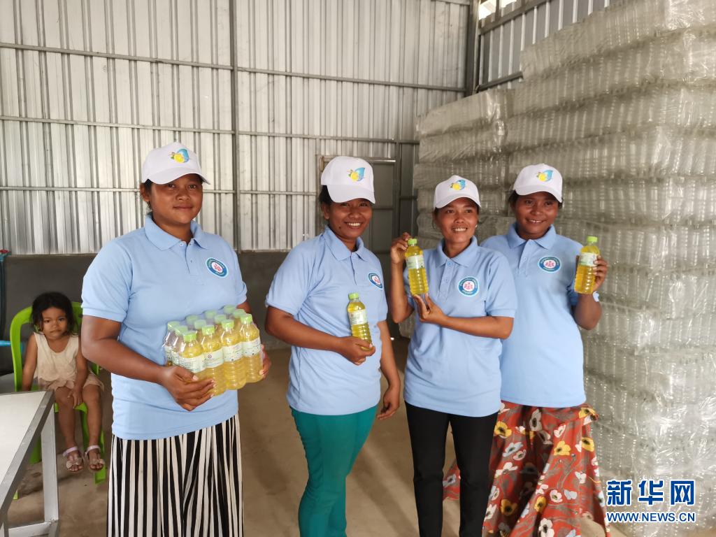 2020年7月31日,村民在柬埔寨干丹省莫穆坎普县斯瓦安普乡的洗洁精加工厂展示生产的洗洁精。