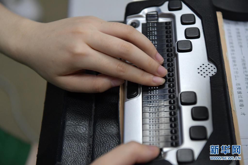 杨虹在自己的家里录制有声读物,她通过这台盲文转换识别设备可以将要录制的小说内容快速识别出来(5月13日摄)。