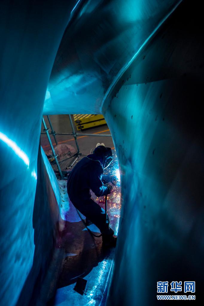 工人在对发电机组所需的转轮进行局部消缺处理(5月14日摄)。新华社记者 江文耀 摄