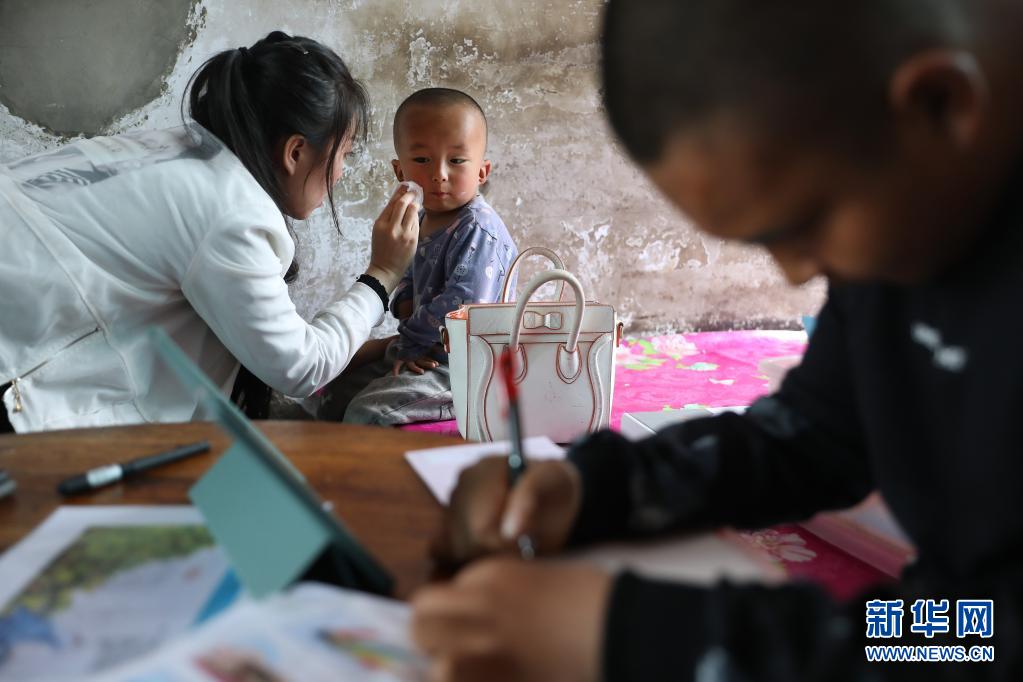 5月14日,特教老师李红来到赛马镇学生施忠达(右一)家里送教,这是李红为施忠达的弟弟擦拭嘴角边的蛋糕屑。新华社记者 姚剑锋 摄
