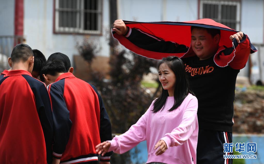 5月13日,凤城市特殊教育学校师生们在操场上自由活动时,一名男同学(右一)用自己的校服为班主任老师姜茹(右二)遮阳。新华社记者 蔡湘鑫 摄