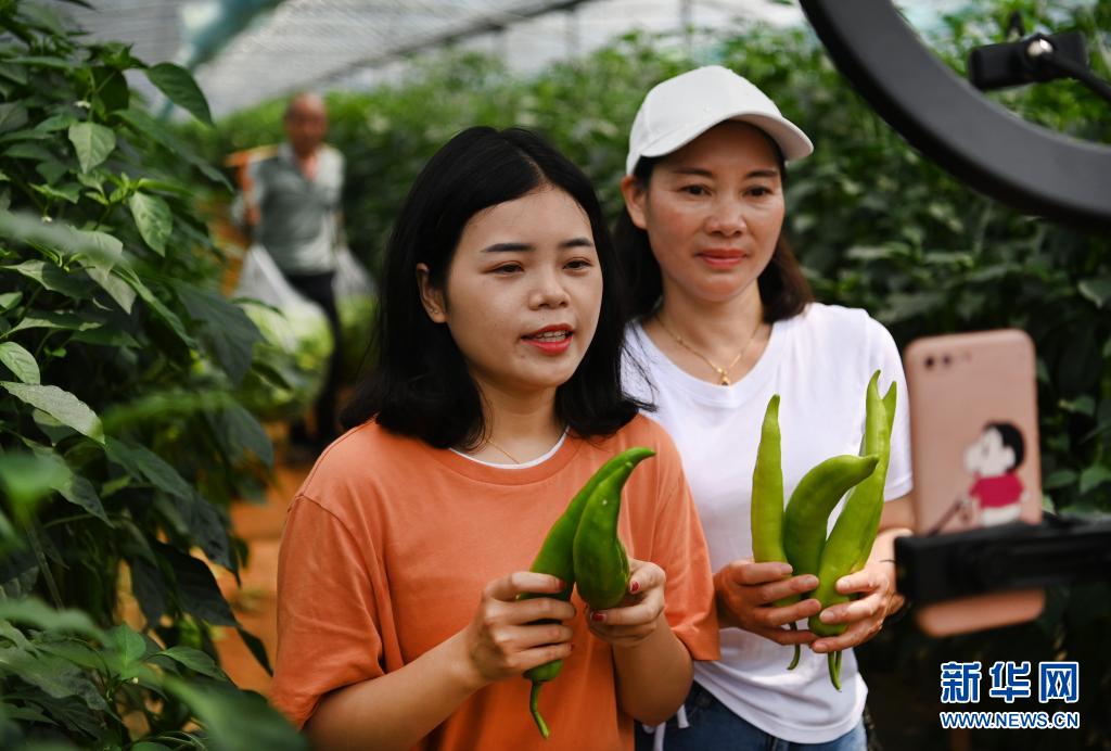 5月16日,安远县鹤子镇阳佳村新时代文明实践员郭燕婷(左)带领村民在本村蔬菜大棚教授直播技巧。该村已有200多名村民利用直播平台推销本村农副产品。自2015年以来,安远县电商服务中心聘请了专业的电商导师免费为村民提供电商培训,让越来越多的农民加入电商直播队伍。